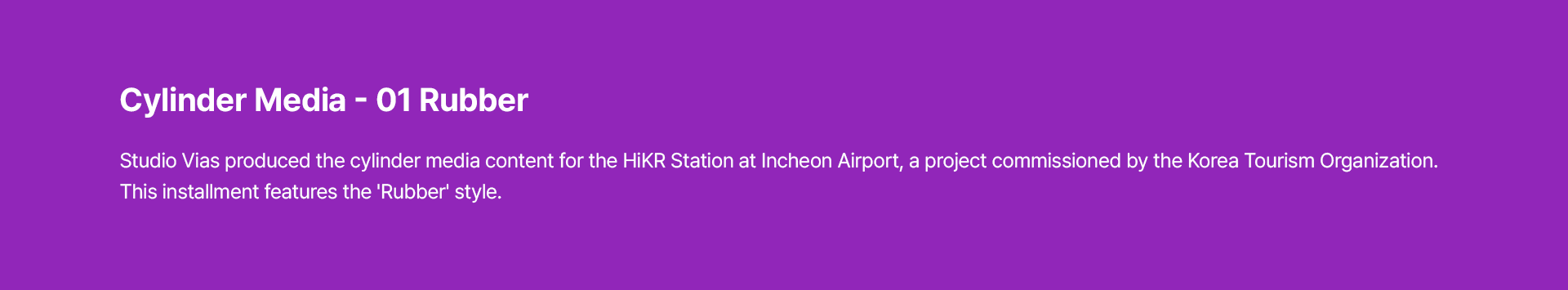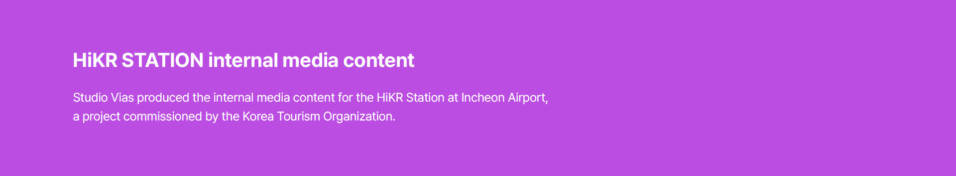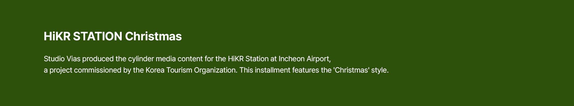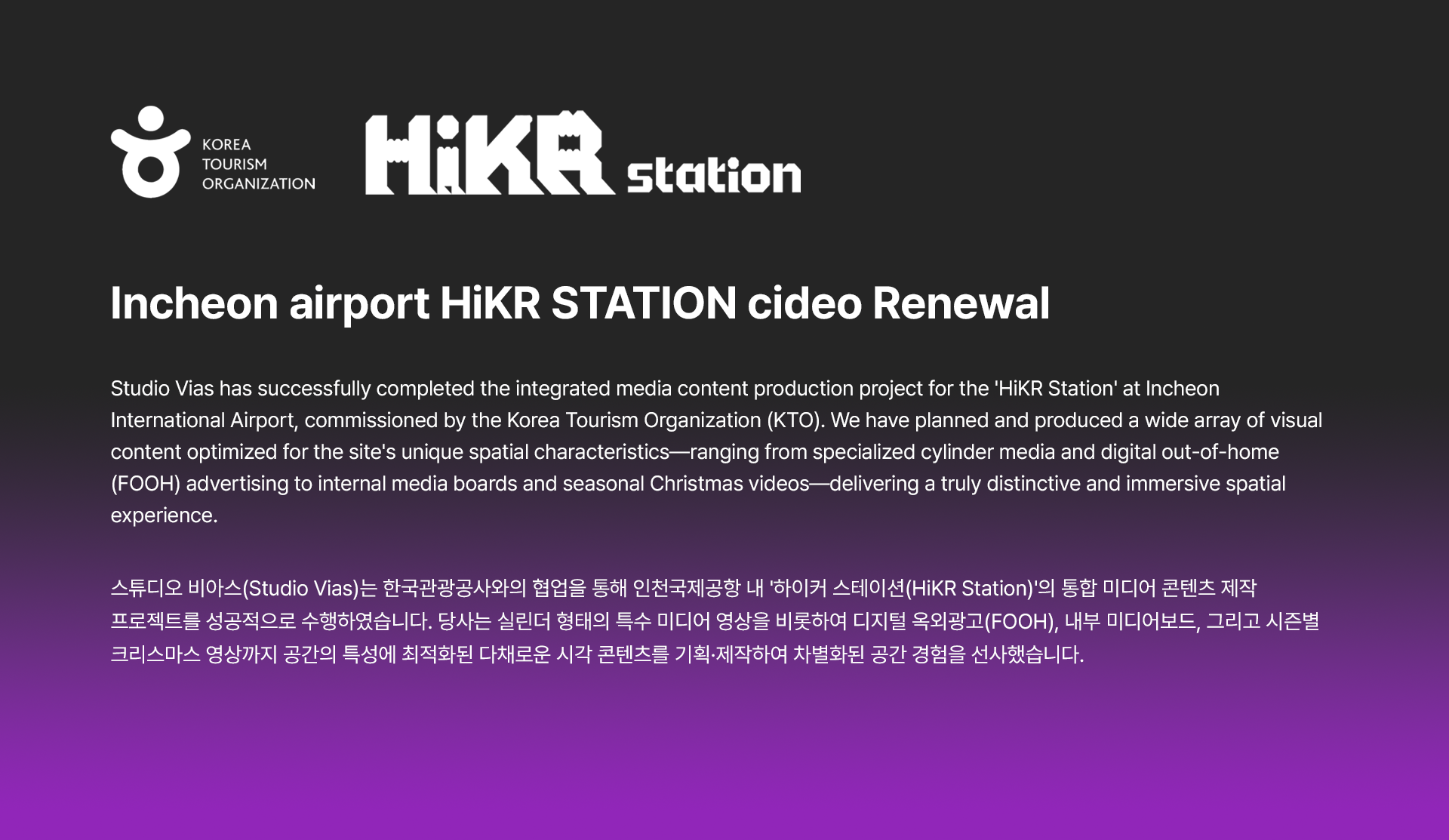 스튜디오 비아스(Studio Vias)는 한국관광공사와의 협업을 통해 인천국제공항 내 '하이커 스테이션(HiKR Station)'의 통합 미디어 콘텐츠 제작 프로젝트를 성공적으로 수행하였습니다. 당사는 실린더 형태의 특수 미디어 영상을 비롯하여 디지털 옥외광고(FOOH), 내부 미디어보드, 그리고 시즌별 크리스마스 영상까지 공간의 특성에 최적화된 다채로운 시각 콘텐츠를 기획·제작하여 차별화된 공간 경험을 선사했습니다.
