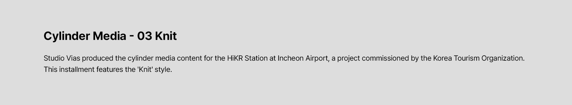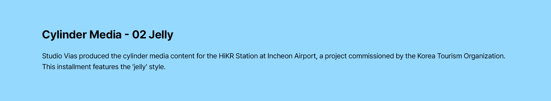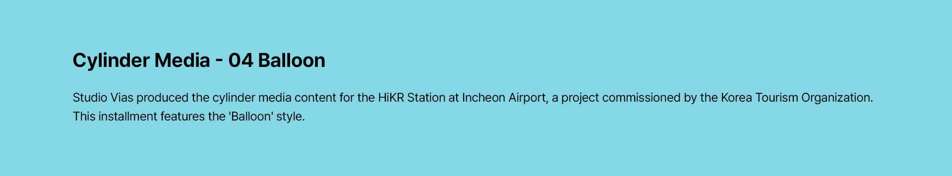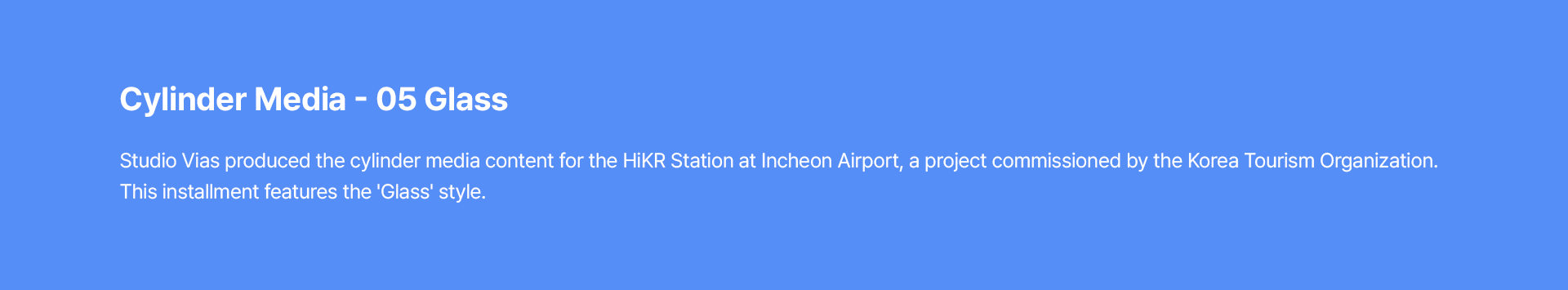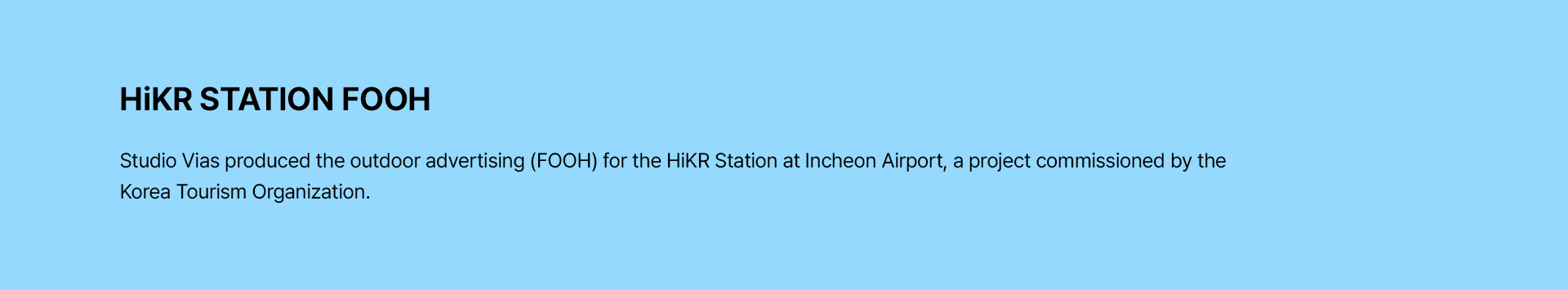스튜디오 비아스(Studio Vias)는 한국관광공사와의 협업을 통해 인천국제공항 내 '하이커 스테이션(HiKR Station)'의 통합 미디어 콘텐츠 제작 프로젝트를 성공적으로 수행하였습니다. 당사는 실린더 형태의 특수 미디어 영상을 비롯하여 디지털 옥외광고(FOOH), 내부 미디어보드, 그리고 시즌별 크리스마스 영상까지 공간의 특성에 최적화된 다채로운 시각 콘텐츠를 기획·제작하여 차별화된 공간 경험을 선사했습니다.